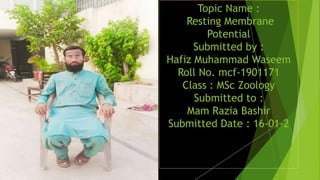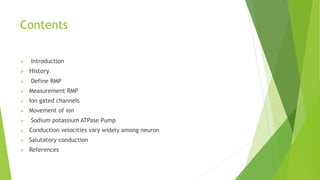 The document discusses resting membrane potential in neurons. It defines resting membrane potential as the difference in charge between the inside and outside of a neuron membrane when the neuron is not conducting an action potential. The inside of the membrane is negatively charged at -70mV due to differences in sodium, potassium, calcium, and protein ion concentrations across the membrane and the selective permeability of the membrane to different ions. Ion channels and the sodium-potassium ATPase pump help maintain the ion gradients and resting membrane potential. Factors like axon diameter and myelination affect how quickly impulses propagate along neurons.