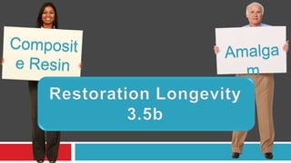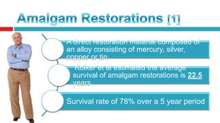 The main reasons for failure of both amalgam and composite fillings according to several studies are secondary caries and fracture of the restoration. Amalgam fillings generally have higher longevity than composites, with survival rates over 10 years of 82-95% for amalgam versus 79-86% for composite according to two studies. However, factors like cavity size, surfaces involved, operator experience, and patient factors like oral hygiene and caries risk can significantly affect longevity. Annual failure rates are typically reported to be 0-7% for amalgam and 0-9% for composite in posterior teeth.