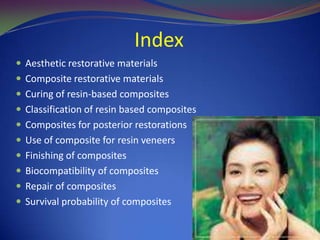 Restorative resins have evolved from early silicate-based materials to modern resin composites. Resin composites are composed of a resin matrix reinforced with inorganic filler particles. They are classified based on filler size and curing mechanism. Developments include microfilled, small particle, and hybrid composites, as well as flowable and packable composites. Resin composites are used for anterior and posterior restorations. Successful use requires acid etching of enamel, dentin bonding agents, and incremental placement techniques to reduce polymerization stresses.