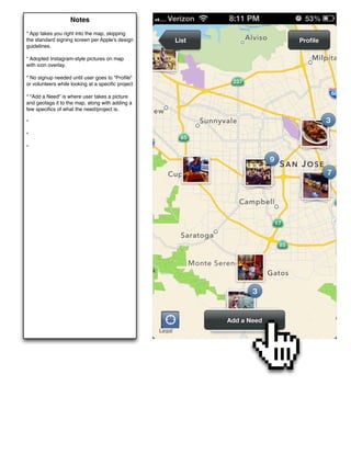The document describes the key features and user flow of the Restore app. The app allows users to view community needs on a map, add new needs by taking photos and adding details, and volunteer for existing needs. Users can sign up with Facebook or email and share volunteer commitments on social media. The app also allows viewing past projects, submitted needs, and account notifications.