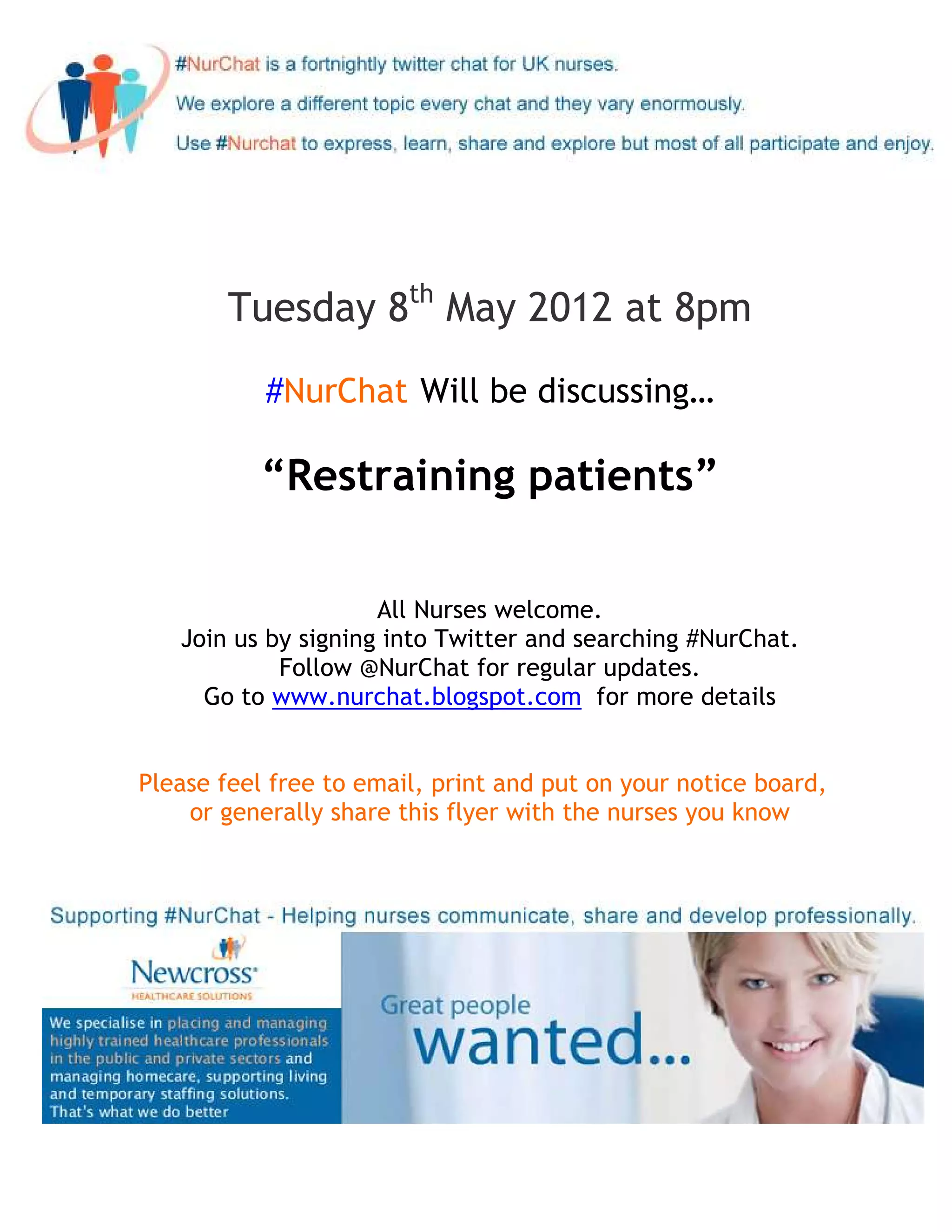 A Twitter chat about restraining patients will take place on Tuesday May 8th at 8pm using the hashtag #NurChat. Nurses are invited to join the discussion by signing into Twitter and searching for or following #NurChat. More details about the chat can be found at www.nurchat.blogspot.com.