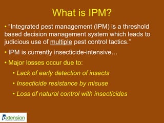 The document discusses integrated pest management (IPM) strategies and new insecticide options for managing pests in peanuts and vegetables. It highlights the importance of early detection, proper insecticide use to prevent resistance, and careful pest identification to enhance effectiveness. Additionally, it provides detailed insecticide recommendations and emphasizes the potential negative impacts of certain insecticides on beneficial species.