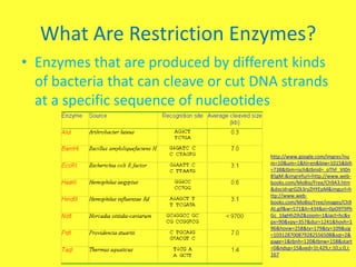 Restriction enzymes are enzymes produced by bacteria that cut DNA strands at specific nucleotide sequences. There are three main types of restriction enzymes: Type I cuts DNA randomly, Type II cuts every 4-6 nucleotides and is most used in biology, and Type III cuts sections up to 25 nucleotides long. Werner Arber and Stuart Linn discovered restriction enzymes, with the first being EcoB from E. coli. Restriction enzymes are used in the recombinant DNA process to cut DNA for insertion into a plasmid or virus for further study and product creation like vaccines.