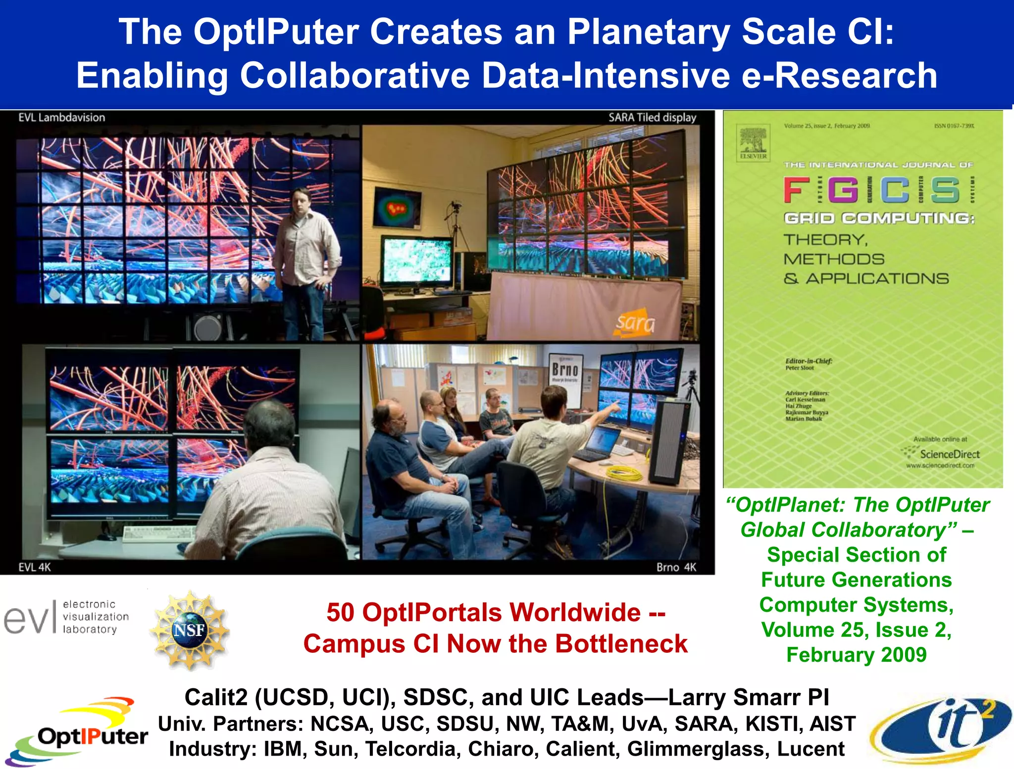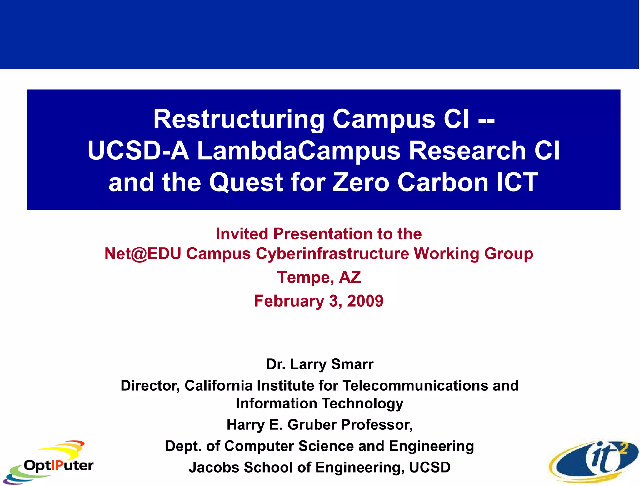 The document discusses the restructuring of campus cyberinfrastructure at UC San Diego (UCSD) to support zero-carbon ICT initiatives and collaborative e-research through the use of the Optiputer technology. It outlines various projects and partnerships aimed at enhancing energy efficiency, reducing carbon emissions, and integrating advanced computing resources within UC campuses. Additionally, it highlights UCSD's commitment to green technologies, including solar and fuel cell systems, and the exploration of new methodologies for carbon footprint reduction in the ICT sector.