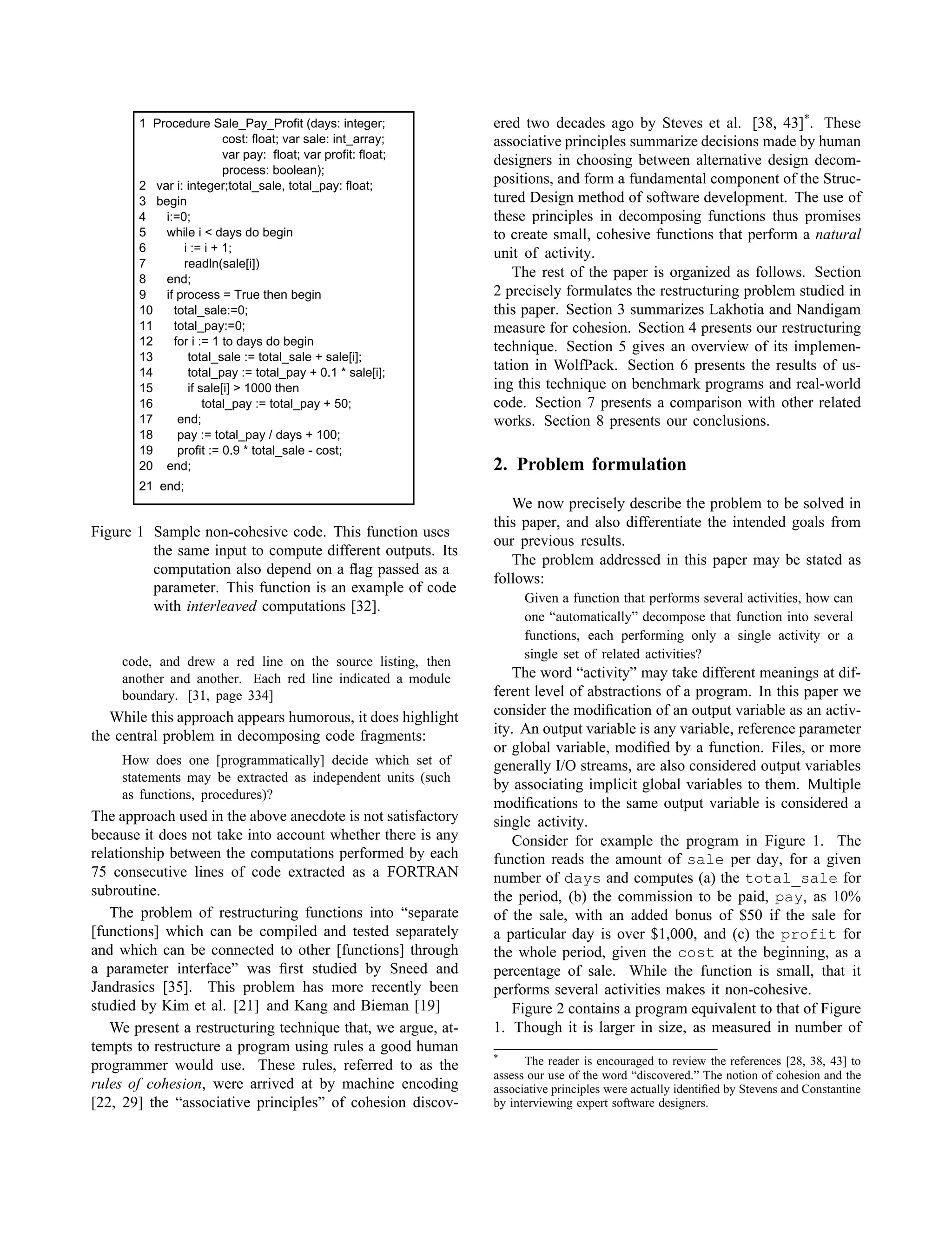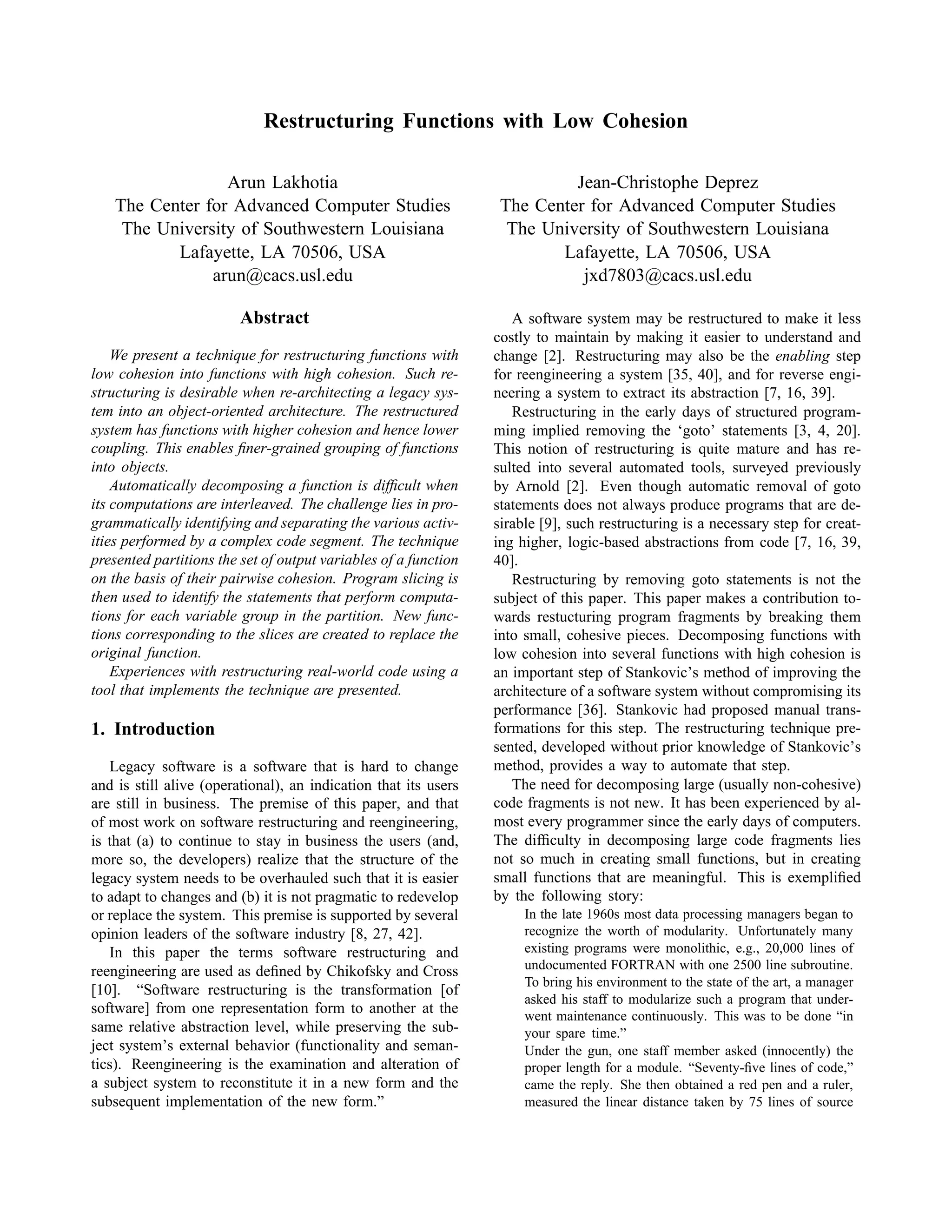 The document presents a technique for automatically restructuring functions with low cohesion into functions with higher cohesion. It does this by partitioning the output variables of a function based on their pairwise cohesion, as measured by rules that encode principles of cohesion discovered by previous research. Program slicing is then used to identify statements computing each variable group, and new functions are created from these slices to replace the original function. The technique aims to decompose functions into natural units of activity, as a human programmer would, in order to improve understandability and maintainability.