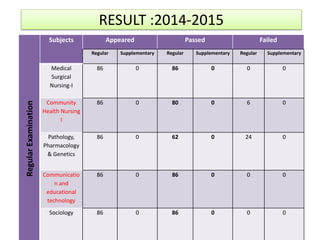 This document analyzes the results of 2nd year B.Sc Nursing students from 2014-2015 to 2017-2018. It shows the number of students who appeared and passed/failed each subject in regular and supplementary exams each year. Overall success rates have increased over time, with the regular exam pass rate rising from 72% in 2014-2015 to 100% in 2017-2018 and the supplementary exam pass rate rising from 95.8% to 100% over the same period. A trend analysis graph demonstrates improvement in success rates across all subjects over the years.