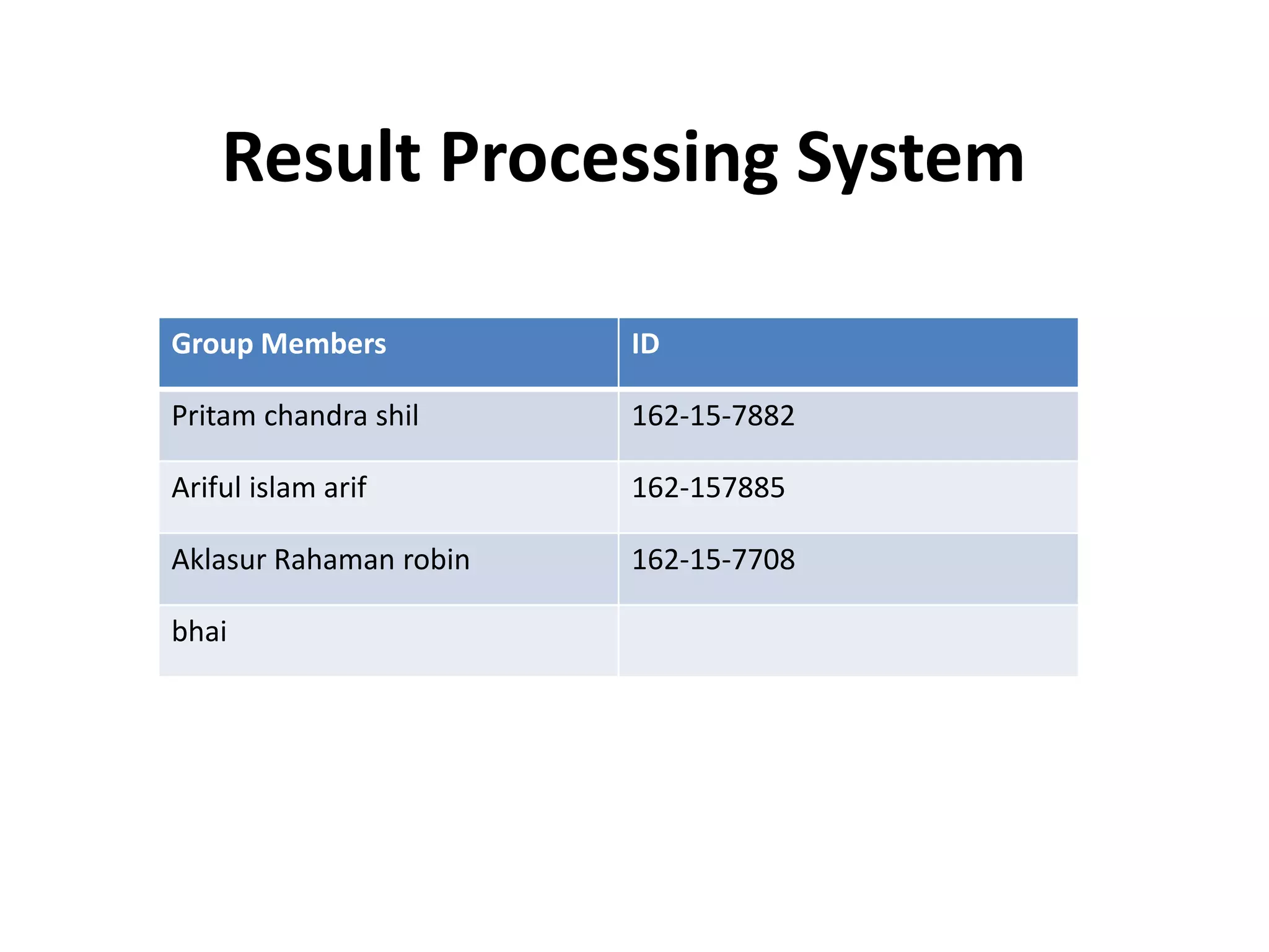 The document presents a result processing system developed by a group, utilizing C++ for managing student records through insertion, searching, and sorting algorithms. It highlights the system's efficiency, user-friendliness, and functionality, alongside its limitations, such as being non-portable and console-based. The project demonstrates effective file handling for database management, showcasing the potential for further development.