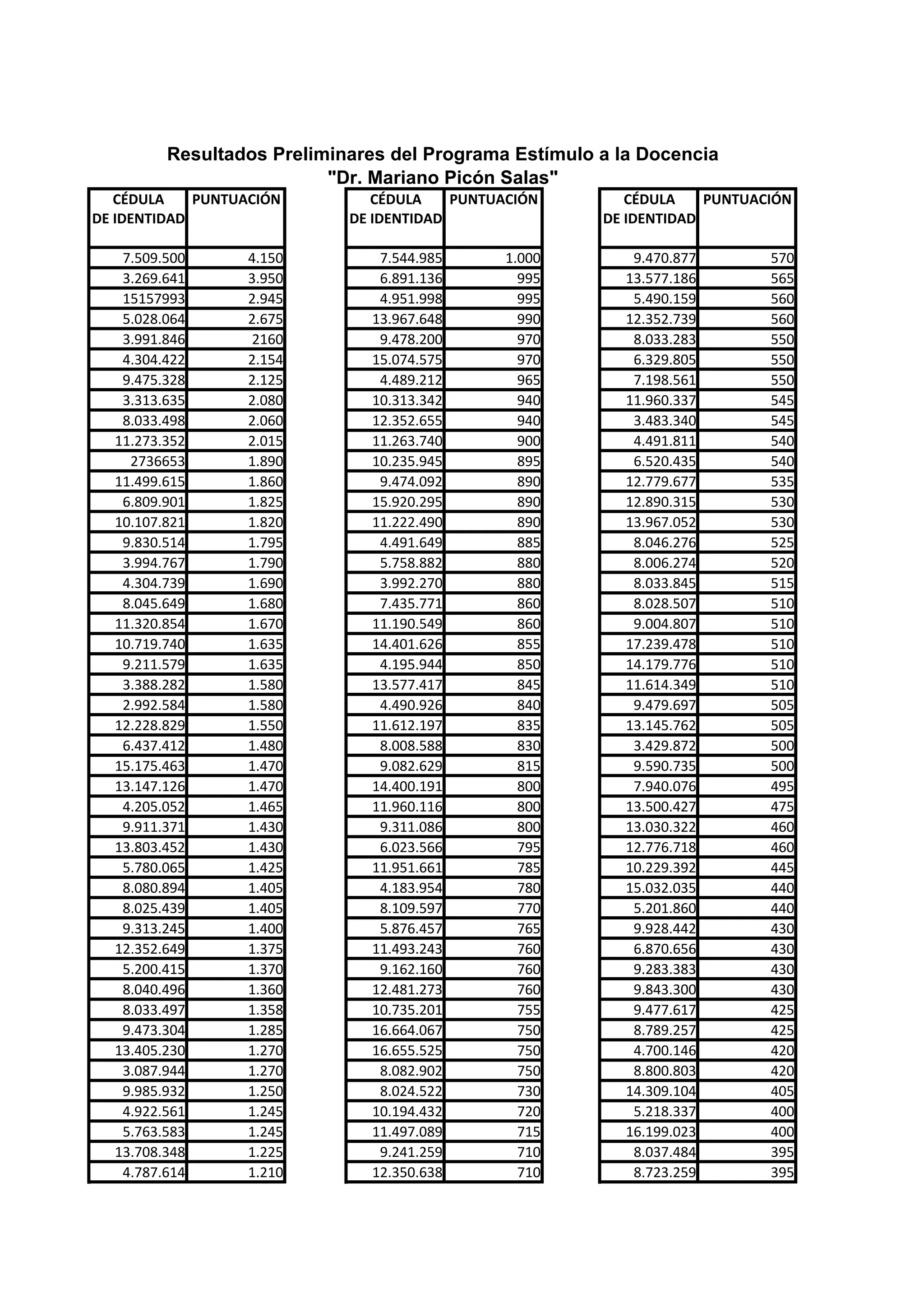 Los resultados preliminares del programa estímulo a la docencia 'Dr. Mariano Picón Salas' presentan una serie de puntuaciones asociadas a cédulas de identidad, indicando la evaluación de los participantes. La información incluye una lista extensa de cédulas y sus respectivas puntuaciones, abarcando una amplia gama de resultados. Este documento refleja los diversos niveles de desempeño de los docentes evaluados en el programa.