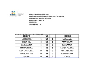 The document provides the results and standings from Matchday 13 of the Sabatino Infantil Football League. It includes the following information in a table: