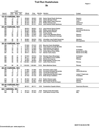 The document provides results from the Trail Run Hualahuises 5k race, including names, times, and age/gender categories of participants. It lists over 50 runners, their finishing times, and places in categories such as 10-19 Male, 20-29 Female, 40-49 Male, and 50-59 Female. The top three finishers in the 10-19 Male category were Hector Daniel Paulin Quiñones in 30:04, Fabian Obregon Hiram in 34:20, and Edgar Ulises Lopez Guerrero in 42:13. The race results appear to have been timed using an online system at www.esport.mx.
