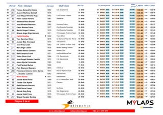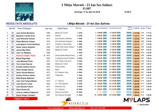 The document appears to be results from a half marathon race called the "Mitja Marató - 21 km Ses Salines" held on April 17, 2016. It lists the bib number, name, year of birth, club/city, official time, real time, and split times for each of the first, second, and last segments of the race for each participant. The top three finishers were Joan Gomila Muntaner with a time of 1:17:51, Benjamin Candel Giner with a time of 1:18:09, and Juan Binimelis Fullana with a time of 1:22:24.