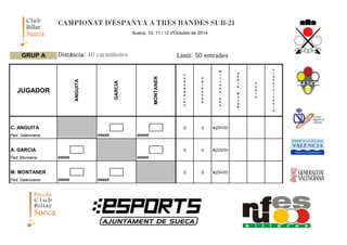 TRES BANDES SUB-21 GRUP A Distància: 40 caramboles Límit: 50 entrades JUGADOR ANGUITA GARCIA MONTANER CARAMBOLES ENTRADES MITJANA GEN. SERIE MAJOR PUNTS CLASSIFICACIÓ C. ANGUITA 0 0 #¡DIV/0! Fed. Valenciana ##### ##### A. GARCIA 0 0 #¡DIV/0! Fed. Murciana ##### ##### M. MONTANER 0 0 #¡DIV/0! Fed. Valenciana ##### ##### Sueca, 10, 11 i 12 d'Octubre de 2014