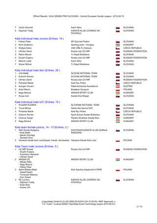 The document provides results from the 32nd Grand Prix Slovakia - Central European Karate League competition held on 2012-04-15. It lists the top finishers in several kata (forms) events separated by gender and age category. Overall, the results show winners from Slovakia, Hungary, Russia, Austria, Poland, Slovenia, Latvia, and other nations across categories for individual and team kata performances.