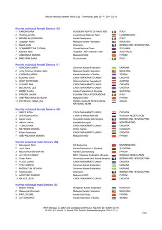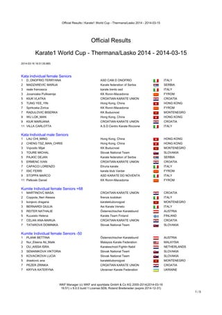 This document provides the official results from the Karate1 World Cup held in Thermana/Lasko, Slovenia in 2014. It lists the top competitors in each category of kata (forms) and kumite (sparring) for both female and male athletes in various weight divisions and age groups. It also lists the top national teams in female and male kumite competitions. Ukraine placed first in both the female and male team kumite events.