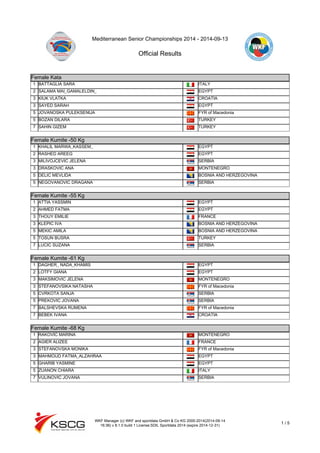 The document provides results from the Mediterranean Senior Championships 2014 competition in karate. Key results include: