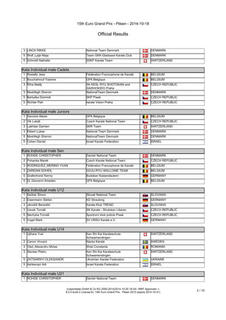 The document provides results from the 15th Euro Grand Prix kata and kumite competitions in Pilsen, Czech Republic in 2014. In the female cadet kata individual under 14 category, Laura Scharff from Denmark placed first and Cecilie Scharff from Denmark placed third. In the female junior kumite individual under 53 category, Anna-Johanna Nilsson from Sweden placed first and Simona Eiblová from the Czech Republic placed second. The document lists multiple other winners across various age groups and weight categories in the kata and kumite competitions.