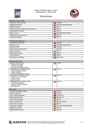 This document provides the results from the Karate1 Premier League competition held in Sharm El Sheikh, Egypt in 2015. It lists the top placing competitors and teams in each category of kata and kumite for both female and male divisions. The French National Kata Team and Ossama Mansour of Egypt won the male team kata and male kumite 84+ kg categories respectively.