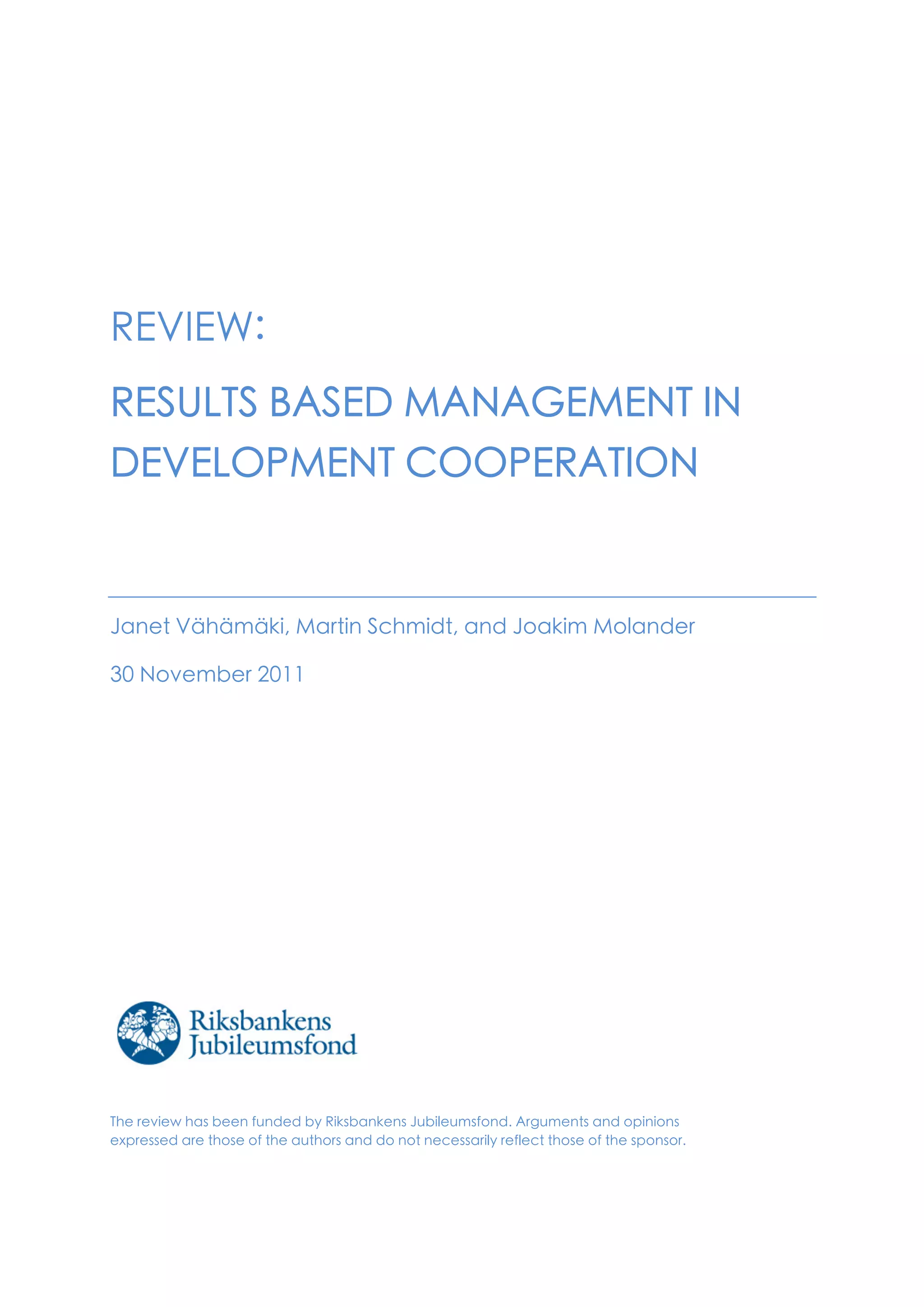 This document provides a review and analysis of current literature on results-based management in development cooperation. It summarizes the key findings from evaluations and reviews on both the challenges and successes of implementing results-based management at different levels. It also outlines some of the global initiatives that have emerged in support of or in response to the results agenda and discusses ongoing trends and debates around this topic.