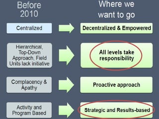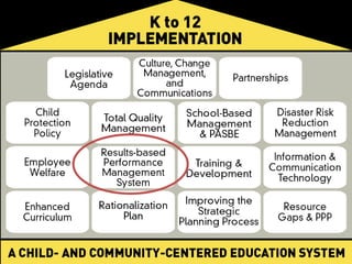 The document outlines DepEd's Results Based Performance Management System (RPMS). The RPMS aims to align individual goals with organizational objectives to improve performance and accountability. It incorporates a four phase process of performance planning, monitoring, review, and rewarding. Key aspects include identifying employee KRAs and objectives, providing feedback and coaching, annually reviewing performance against targets, and using competencies for development. The system is intended to strengthen DepEd's efforts towards its mission of providing quality education.