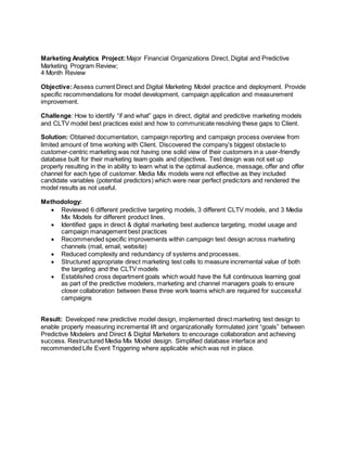 William Tangalos provides marketing analytics consulting for various clients. One project involved developing predictive models to recommend the highest probability products to representatives within 45 seconds of a call. This increased high-speed internet sales by over 25%. Another project reviewed a financial organization's direct marketing program and identified gaps in modeling, testing, and collaboration between teams. Recommendations simplified processes and established shared goals, resulting in improved predictive models and test designs.