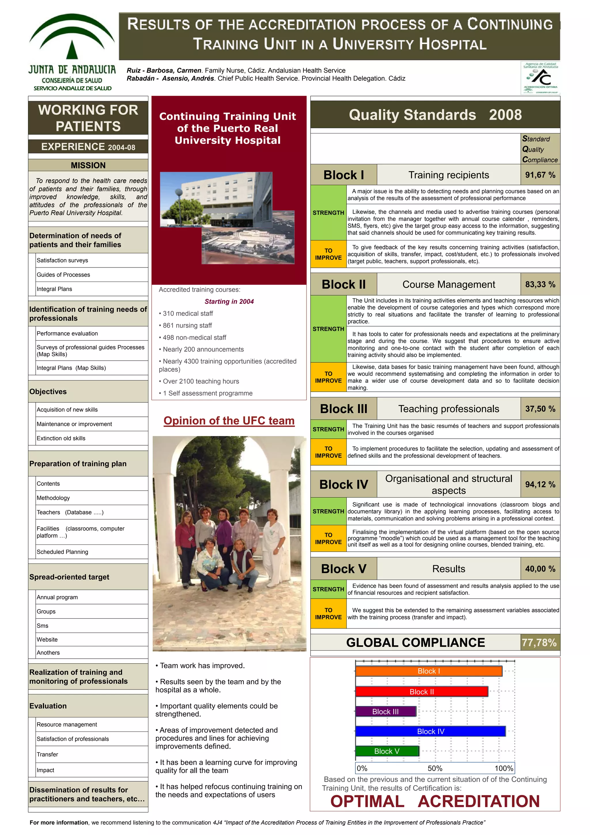 This document summarizes the results of an audit of the Continuing Training Unit of the Puerto Real University Hospital in Spain from 2004-2008. Over this period, the Unit provided over 4,300 accredited training opportunities to over 1,600 medical, nursing, and non-medical staff. The audit assessed the Unit's compliance with quality standards across five blocks: needs assessment, course management, teaching professionals, organizational aspects, and results. Overall compliance was rated at 77.78%, with the Unit meeting strengths in needs assessment, course management, and organizational aspects. Areas for improvement included developing procedures for teacher selection and assessment, implementing a virtual learning platform, and expanding results assessment. The audit found that accreditation helped refocus training