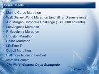 This document introduces a results publishing platform that provides live results, mobile apps, photos, videos and maps for races and events. Some of the major races that use this platform are listed. The presentation objectives are to describe the technology, 24/7 support, integration tools and service. Key features include an embedded, customizable and vendor-neutral platform that supports running, cycling, triathlons and teams. Messaging and support statistics are shown. Implementation is described as simple, requiring only Javascript embedding. Various result viewing options and operational modes are outlined. Unlimited use of products is offered to timing companies for set prices per event.