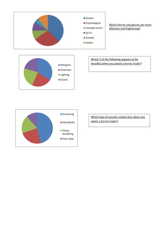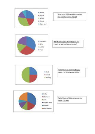 The document discusses common tropes and elements found in horror movies, including psychological horror and slasher films being effective subgenres, chainsaws and screaming sounds creating fear, forests being an effective horror movie location, teenagers and girls being vulnerable characters expected to see, coats being identified with villains, knives and chainsaws being common props, blood and violence making trailers menacing, and unknown villains being more frightening than known ones.