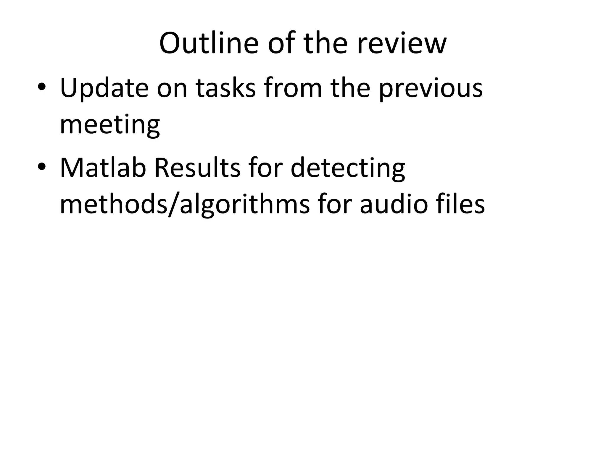 The document provides a review and results from experiments comparing audio files using Matlab and Labview algorithms to detect differences between identical and non-identical files. It outlines tasks from a previous meeting and issues encountered integrating audio analysis tools into the NI myRio software. Matlab results are presented comparing various audio file pairs that are both identical and non-identical, detecting differences between the files. Preliminary Labview results are also shown comparing one pair of non-identical audio files.