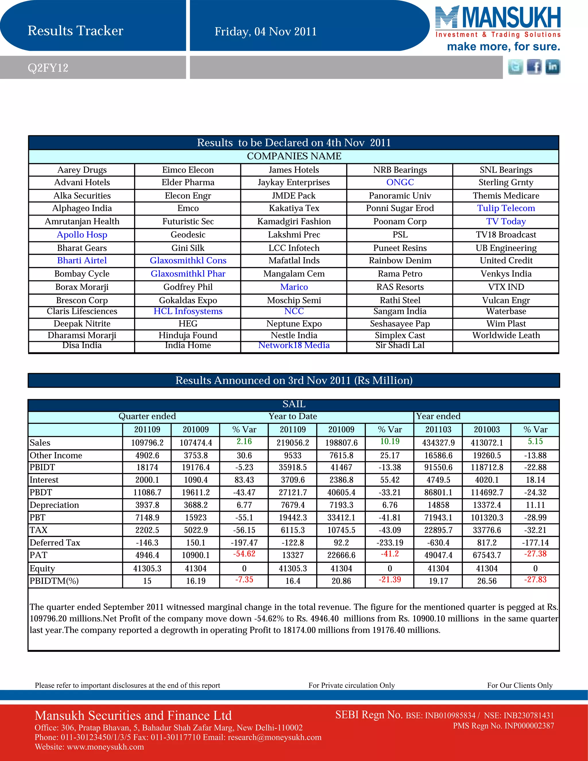 The document provides quarterly financial results for several companies. For SAIL, total revenue increased marginally in the September 2011 quarter compared to the prior year. Net profit declined 54.62% and operating profit decreased. For Goodyear India, revenue grew 15.82% in the September 2011 quarter while net profit declined 15.77% and operating profit decreased. For Hatsun Agro Products, revenue increased 12.64% in the September 2011 quarter and operating profit grew 46.21% compared to the prior year.
