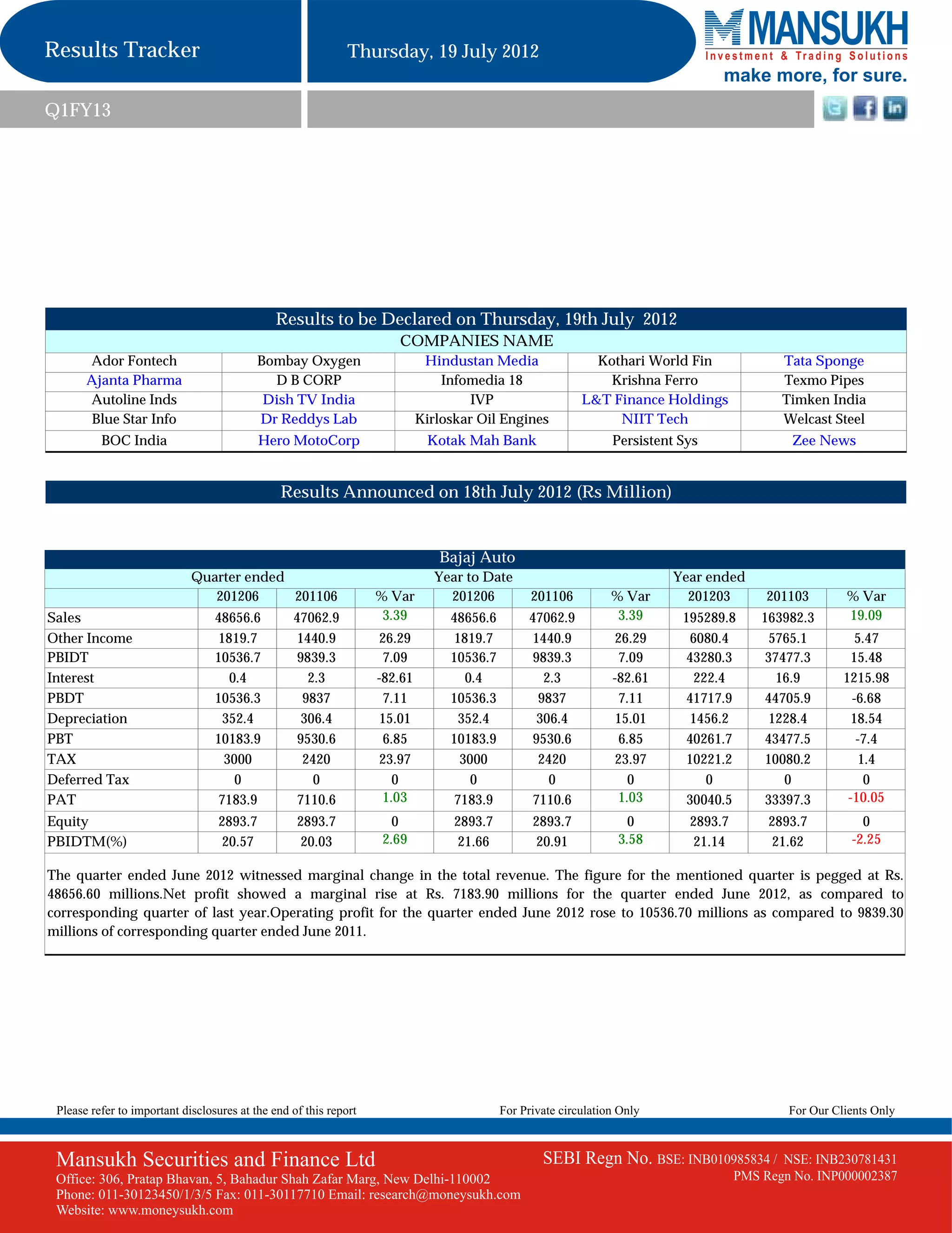 - Bajaj Auto's total revenue for the quarter ended June 2012 saw a marginal increase of 3.39% to Rs. 48,656.6 million. Net profit increased marginally by 1.03% to Rs. 7,183.9 million for the same quarter.