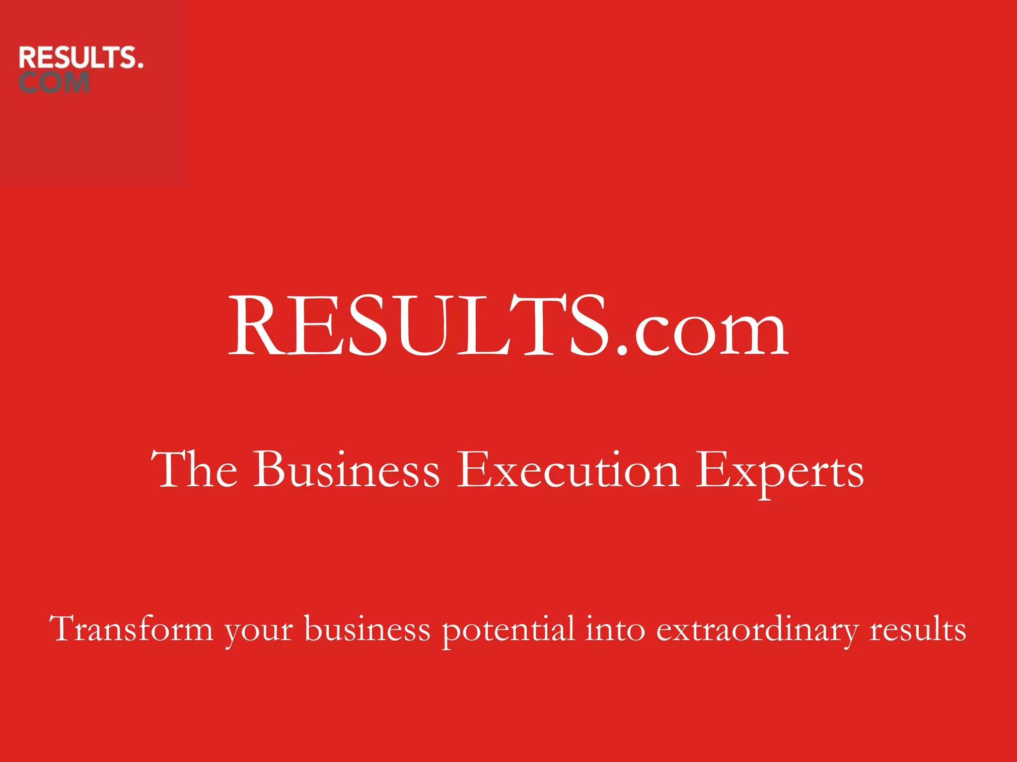 RESULTS.com is a business consulting firm that helps clients transform their business potential into extraordinary results. They work with ambitious business leaders seeking improved performance. RESULTS.com implements best practice strategic planning and execution methodologies. They track measurable results and engage employees in delivering extraordinary outcomes. The firm's goal is to have 10 million people engaged in executing strategic plans by 2020.