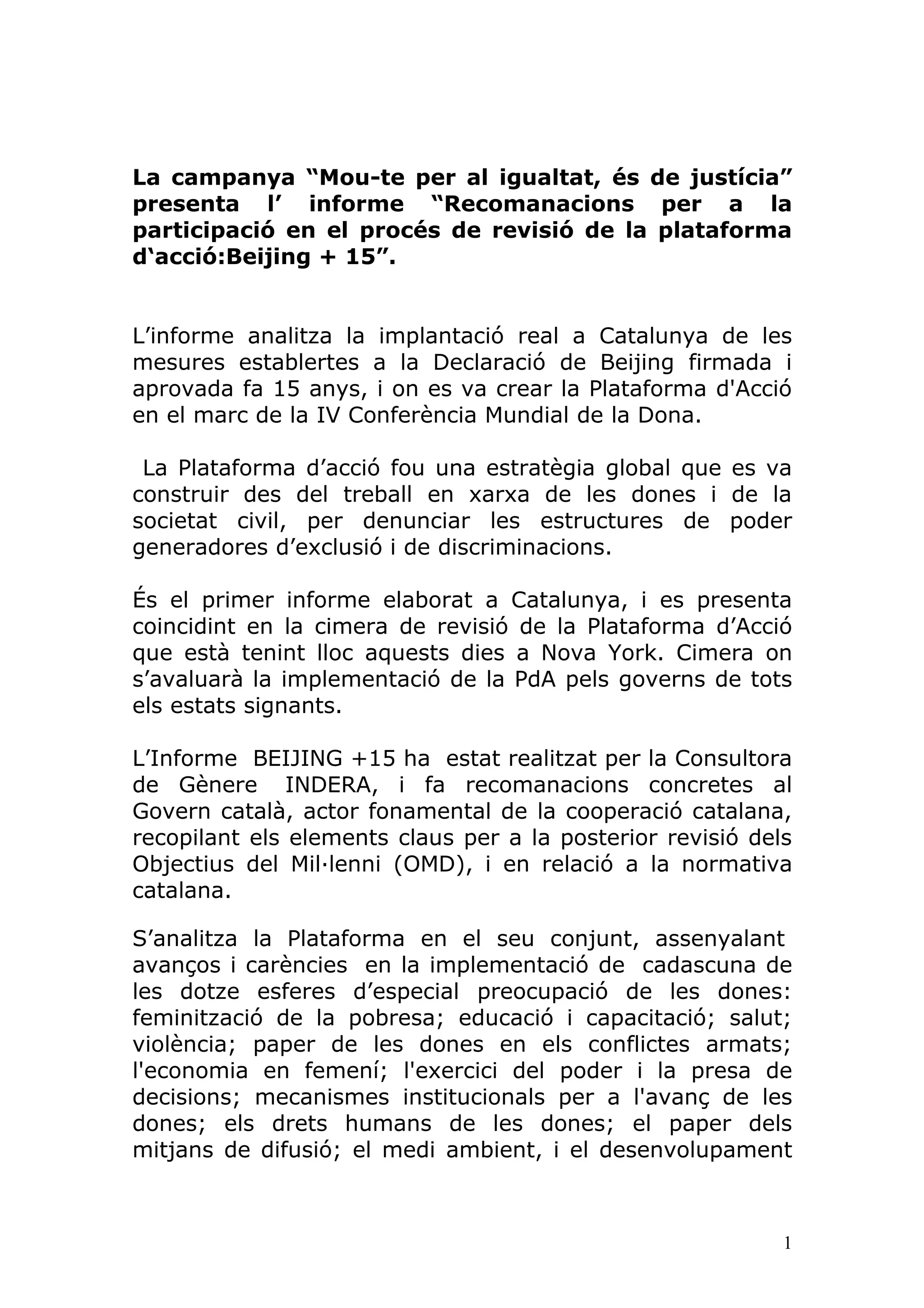 L’Informe BEIJING +15 ha estat realitzat per la Consultora