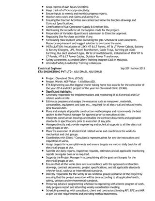Waseem Akram Khan has over 5.9 years of experience as an electrical engineer managing large construction projects. He has experience managing teams of up to 80 people and has worked on numerous power plants, hospitals, and commercial buildings. His experience includes managing budgets, schedules, and all electrical installation work. He holds a Bachelor's degree in Electrical Engineering and is proficient in all aspects of electrical design, installation, and project management.