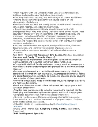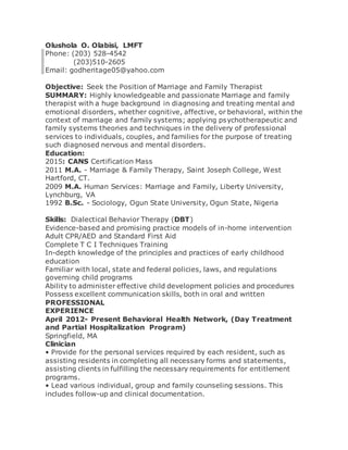 This document provides a summary of Olushola O. Olabisi's qualifications and experience as a Marriage and Family Therapist. It includes contact information, objective, education history with degrees in marriage and family therapy and human services, skills and licenses, and professional experience providing therapy and case management services to individuals, couples, and families.