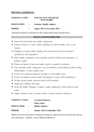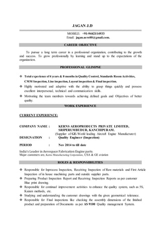 Jagan J.D. is a quality engineer with over 4 years of experience in quality control in aerospace manufacturing, working at Kerns Aeroproducts and having held positions in other organizations. He has expertise in inspections, customer quality assurance, and continuous improvement processes, with a solid educational background in aeronautical and robotics engineering. Jagan is skilled in various technical software and tools, and is committed to contributing to organizational growth and quality standards.