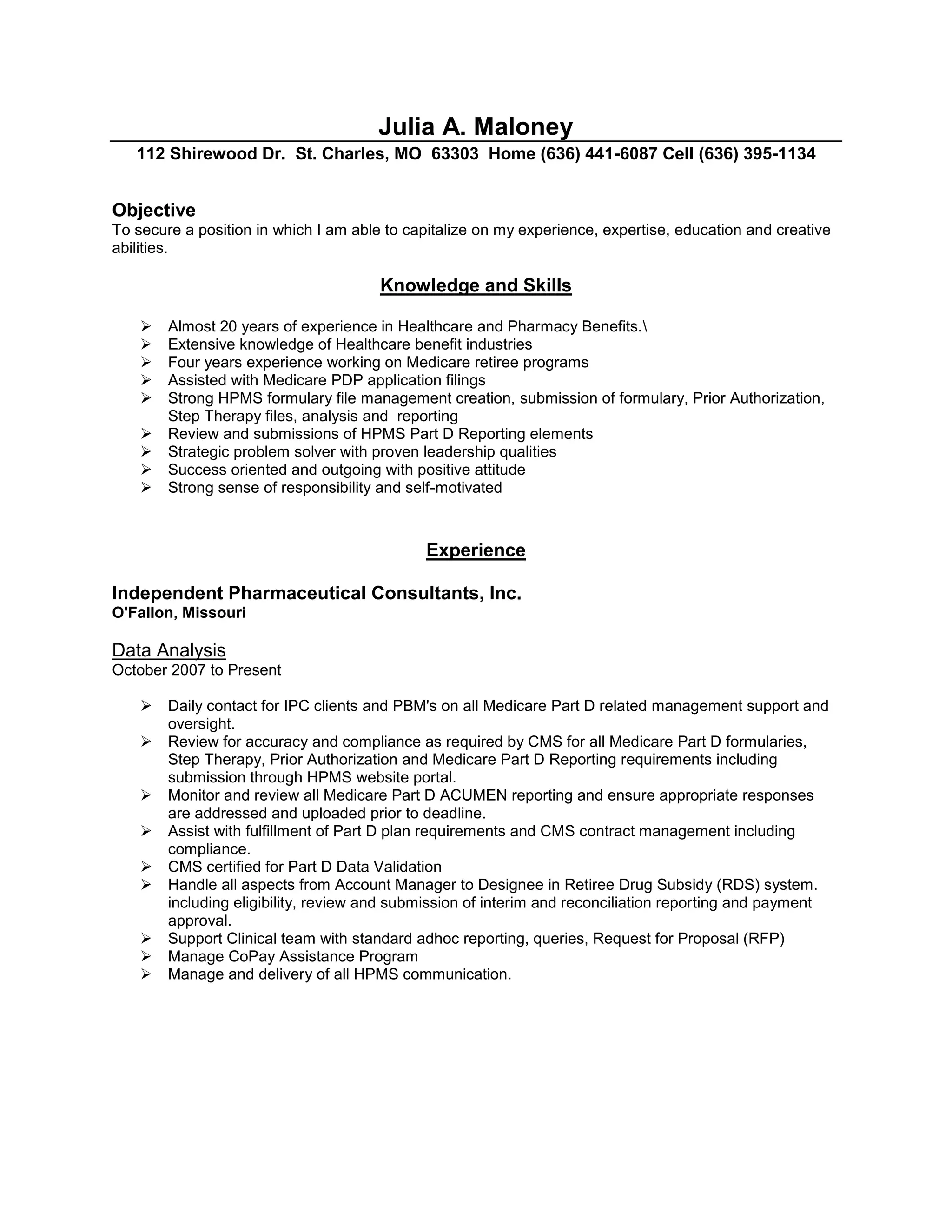 Julia Maloney is seeking a position that utilizes her almost 20 years of experience in healthcare and pharmacy benefits. She has extensive knowledge of healthcare industries and Medicare programs from roles managing Medicare Part D data and ensuring compliance. Maloney has a proven track record of strategic problem solving and leadership with clients and PBMs.