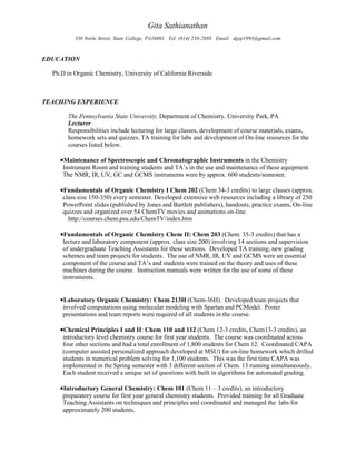 Gita Sathianathan has extensive teaching experience as a lecturer at Penn State University where she taught a variety of chemistry courses including organic chemistry, general chemistry, and introductory chemistry. She developed online course materials and maintained laboratory instruments. Sathianathan has a Ph.D. in Organic Chemistry from UC Riverside and research experience there and at Penn State. She has published papers and presented on topics related to organic chemistry synthesis and conformational analysis.