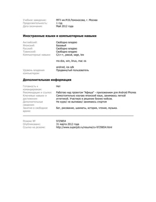 Монгуш Айрана Кадыр-Ооловна ищет работу программистом-стажером или программистом-аналитиком с желаемой зарплатой 20 000 руб. в месяц. У неё неполное высшее образование по специальности 'математика' из МГУ и опыт работы репетитора. Она свободно владеет английским и русским языками, имеет навыки программирования на C/C++, а также опыт работы с разработкой приложений для Android.