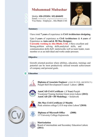 Muhammad Mubashar is seeking a position in a reputable organization and highlights his solid academic record, extensive job experience in civil architecture, and proficiency in AutoCAD and 3D Max. With 7 years of experience and a strong skill set in problem-solving and communication, he is currently working in Abu Dhabi and is eager to contribute to company goals. His education includes various technical certifications and he has held positions as a draughtsman and architect designer, demonstrating his capability in project management and design preparation.