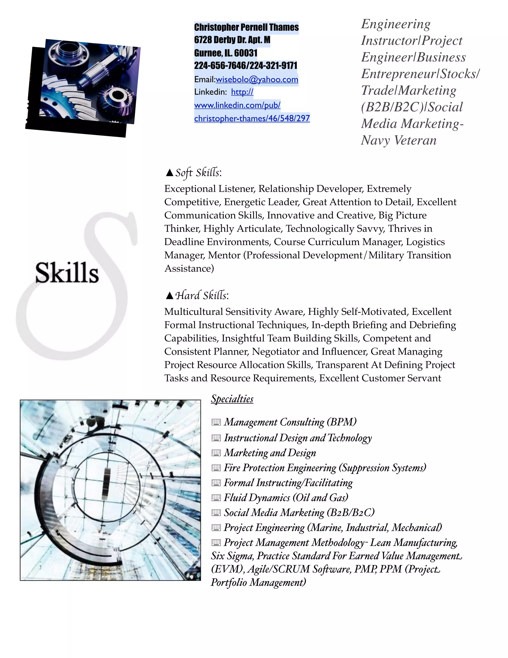 This document provides a summary of Christopher Pernell Thames' contact information, work experience, skills, education, and certifications. It identifies his areas of specialty as management consulting, instructional design, marketing, fire protection engineering, and social media marketing. It also lists his soft skills such as being an exceptional listener and innovative thinker. His hard skills include being highly self-motivated and having excellent project management skills. His work experience includes serving in the U.S. Navy and working as an engineering instructor. He has obtained certifications in areas such as gas-free engineering and as a Navy master training specialist.
