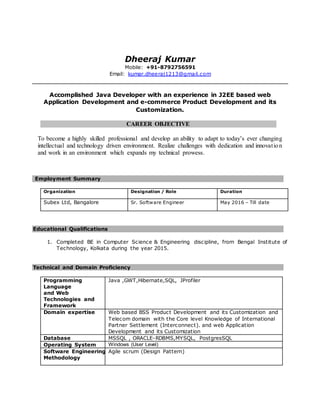Dheeraj Kumar is a Java developer with over 5 years of experience developing web applications using technologies like Java, J2EE, GWT, Hibernate and SQL. He is currently working as a Senior Software Engineer at Subex Ltd where he has worked on projects involving rate sheet processing, deals, rerate and duplicate XDR check for telecom clients. He is seeking new opportunities to further expand his technical skills and experience in an innovative environment.