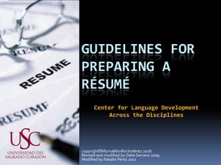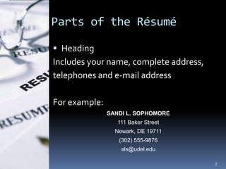The document provides guidelines for preparing a résumé, including sections to include such as contact information, career objective, education, work experience, skills, and design tips. Key sections to include are name, address, phone number and email at the top (heading); a short career objective; education history including degrees and dates; relevant work experience with dates, employers and responsibilities; and a skills summary. The résumé should be concise, with consistent formatting, and free of errors.