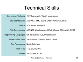 Ricardo Sotolongo is a software developer with experience in .NET, C#, JavaScript, SQL and other technologies. He has over 10 years of experience in roles such as senior systems engineer, senior .NET developer, and software developer. He holds a Ph.D. in Computational Intelligence and Systems Science from Tokyo Institute of Technology and a B.Sc. in Computer Science. His interests include software development, application support, and computer programming.