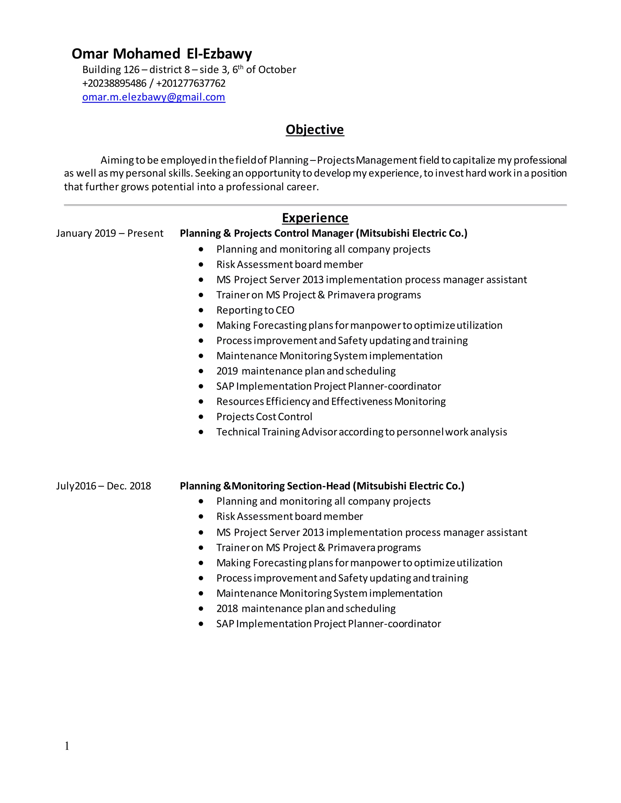 Omar Mohamed El-Ezbawy is seeking a position in project planning and management. He has over 5 years of experience in these fields, currently working as the Planning & Projects Control Manager at Mitsubishi Electric Co. Previously he was the Planning &Monitoring Section-Head also at Mitsubishi Electric Co. and the Senior Projects Engineer at Giza Projects Company. He has a variety of skills in areas such as MS Project, Primavera, risk assessment, and process improvement.