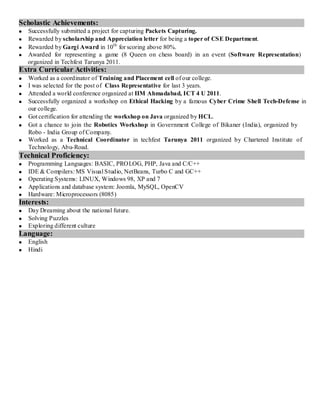 This document is a resume for Vaishali Agrawal summarizing her educational and professional experience. It includes details about her B.Tech degree in computer science and engineering from Chartered Institute of Technology in Rajasthan with a 7.7 CGPA. It also lists her secondary education qualifications and results, a summer internship developing an educational portal in Joomla, undergraduate projects in packet capturing and solving the 8 queens puzzle problem using recursion, research papers published, technical skills and interests.