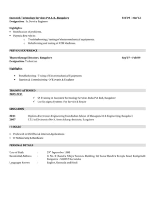 Mukunda has over 5 years of experience in technical support and troubleshooting of electromechanical equipment. He has expertise in servicing ATM machines from Wincor Nixdrof and NCR Corporation. Mukunda is proficient in SAP and has worked on data entry related to repair activities. He aims to obtain a position in technical support, team management or customer relationship management.