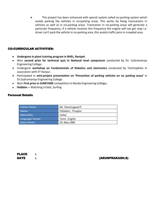 1. Arunprakash S provides his contact information and educational background, having earned a BE in ECE from Maharaja Prithvi Engg. College with a 7.51 CGPA and interests in electronics devices and programming.