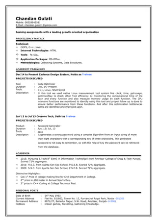 Chandan Gulati is seeking assignments with a leading growth oriented organization. He has proficiency in OOPS, C++, Java, HTML, PL-SQL, MS Office, operating systems, and data structures. He completed projects in code optimization using C++ and Linux and password generation using Java. Currently pursuing his B.Tech in Information Technology, he has received prizes for collage making, running, and C++ coding.