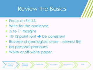 The document provides guidance on resume basics and formatting. Key points include focusing on skills, using a reverse chronological format, including sections for education, experience, and skills, and emphasizing accomplishments through strong action verbs and quantifiable results. Sections should be consistently formatted, with experiences divided into related, leadership, and other categories.