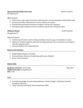 Destine Rivers is seeking an accounting internship and has a background in business administration and accounting. She has relevant work experience including internships at the EPA and AmeriCorps where she assisted with outreach, events, and tutoring. She also has experience working as a cashier, daycare assistant, and office assistant during her time at Claflin University where she maintains a 3.28 GPA studying towards a BS in accounting.
